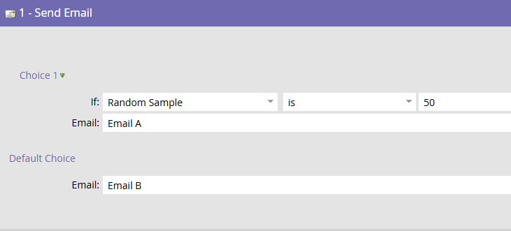 What’s Random Sample? It’s both a Smart List Filter and a Flow Step Choice that takes a percentage of the audience and execute its Flow Step against that group. Like this: