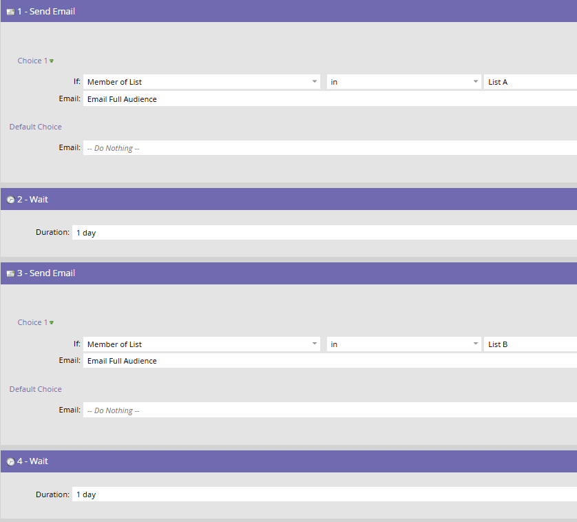 … and so on with Lists C and D. Of course you could also set up four batches with the respective List in the Smart List instead of in the Choice.